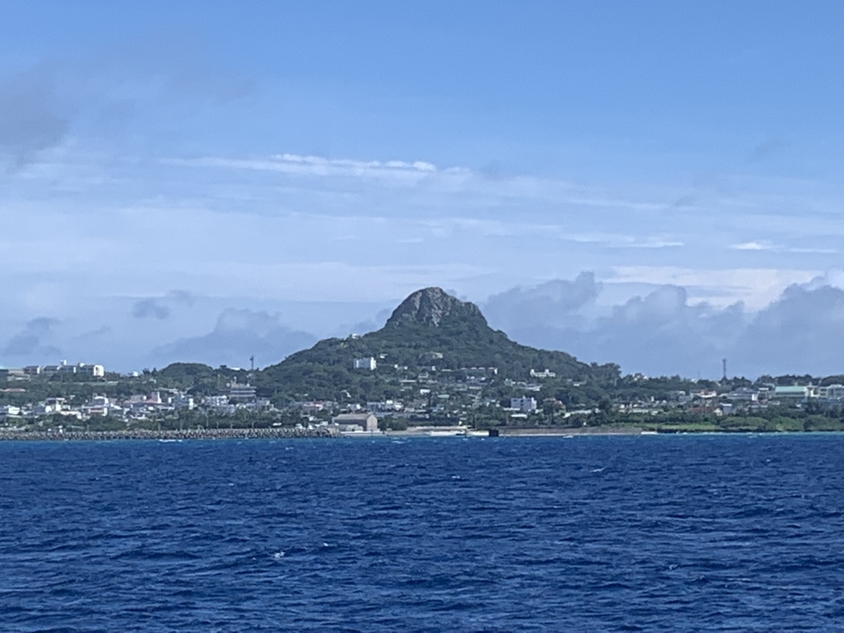フェリーに乗船して、20分ほどで伊江島が見えてきます。