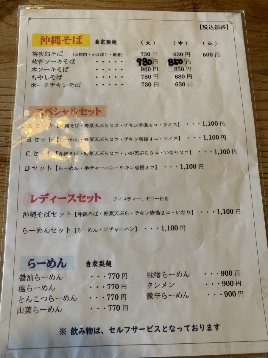 沖縄そばとチキン唐揚げや、天ぷらなどの組み合わせが複数あり、いなりや白飯も選択できます。