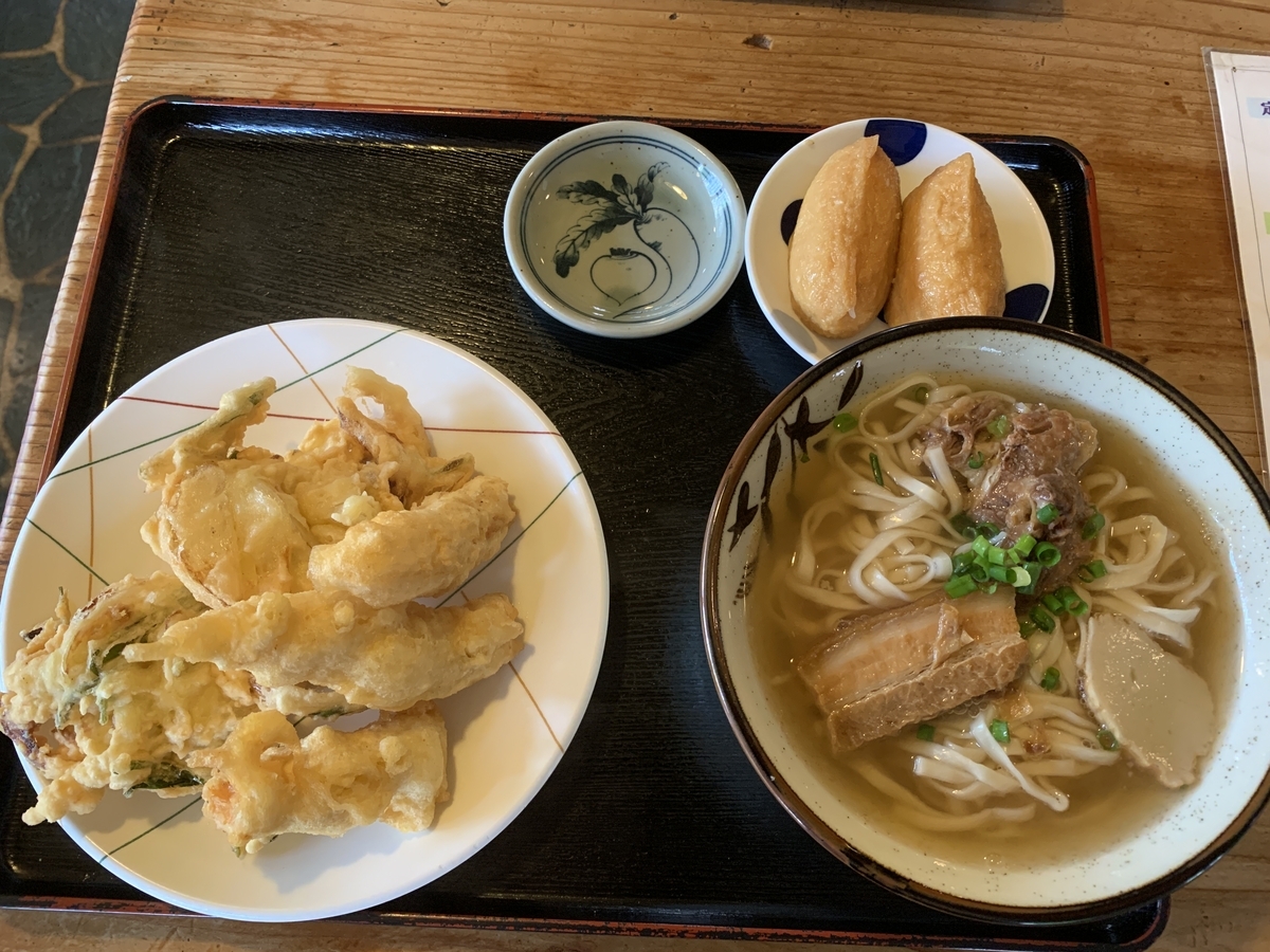 沖縄そばに、いなり、天ぷら(野菜2個、イカ3個)というわんぱくなメニュー。