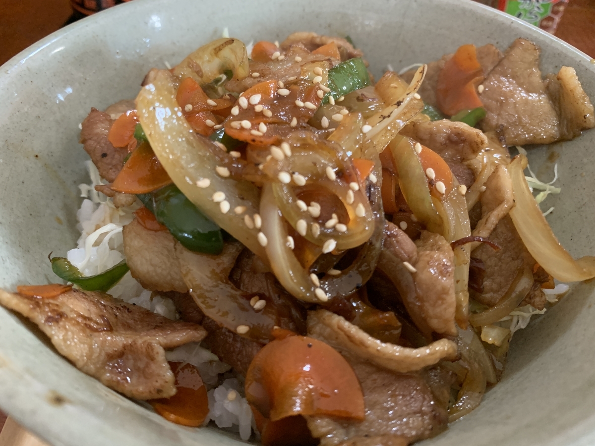ニンジン、ピーマン、玉ねぎ、豚肉を、白飯で食べる幸せ。