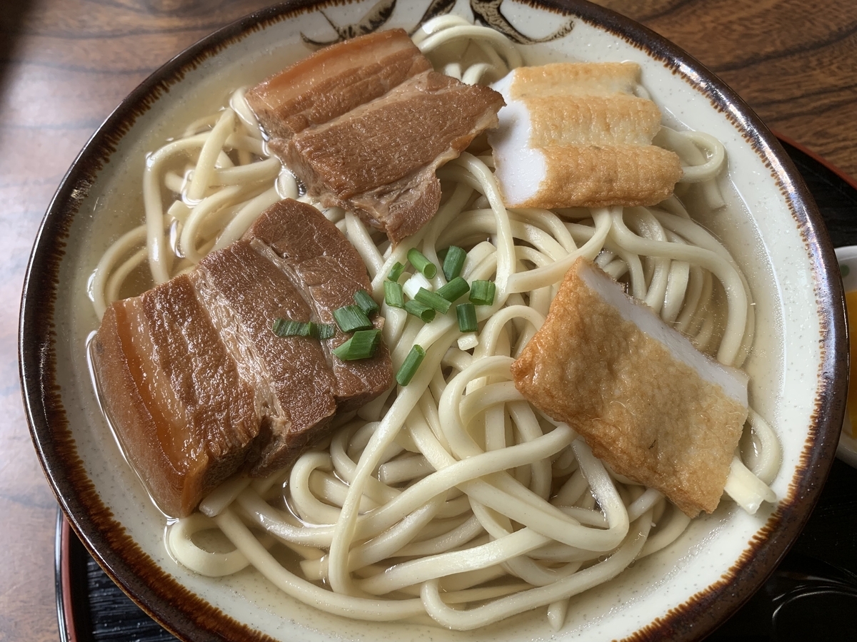 三枚肉とかまぼこ、ネギが載ったオーソドックスな宮古そば。