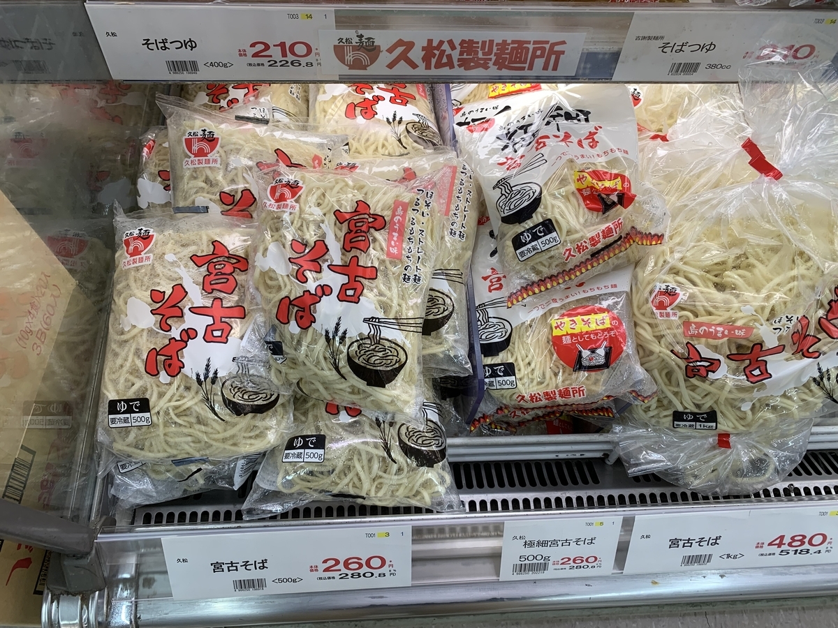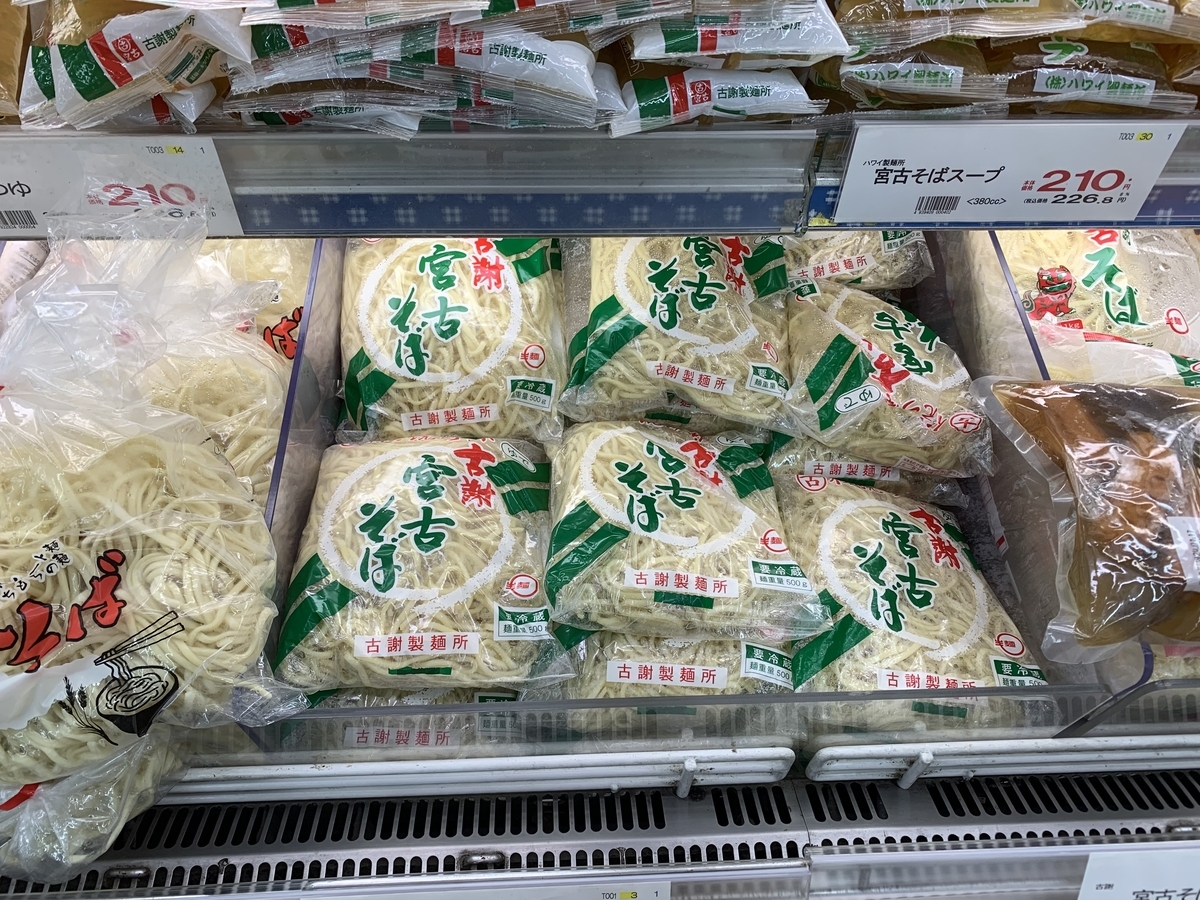 宮古島でも同様に、地元のスーパーでは宮古そばの麺がたくさん販売されていました。