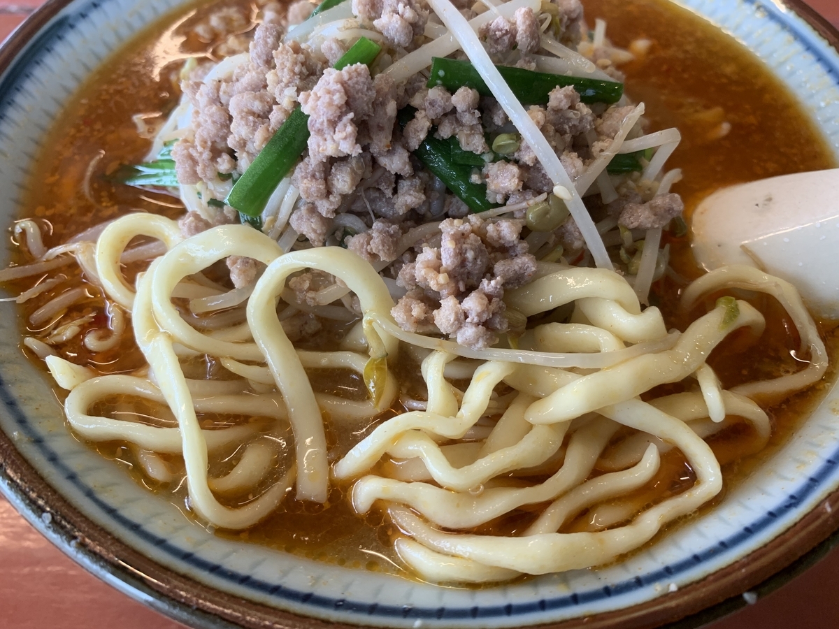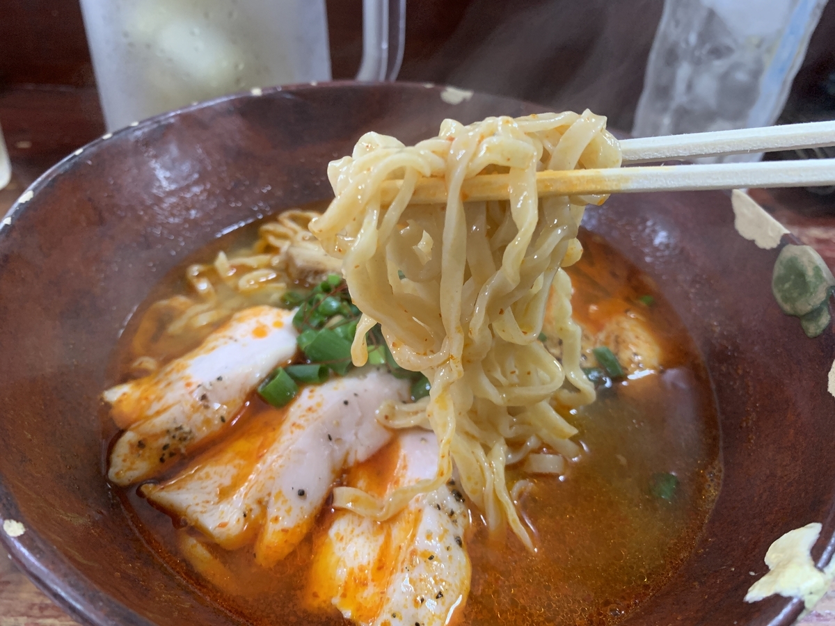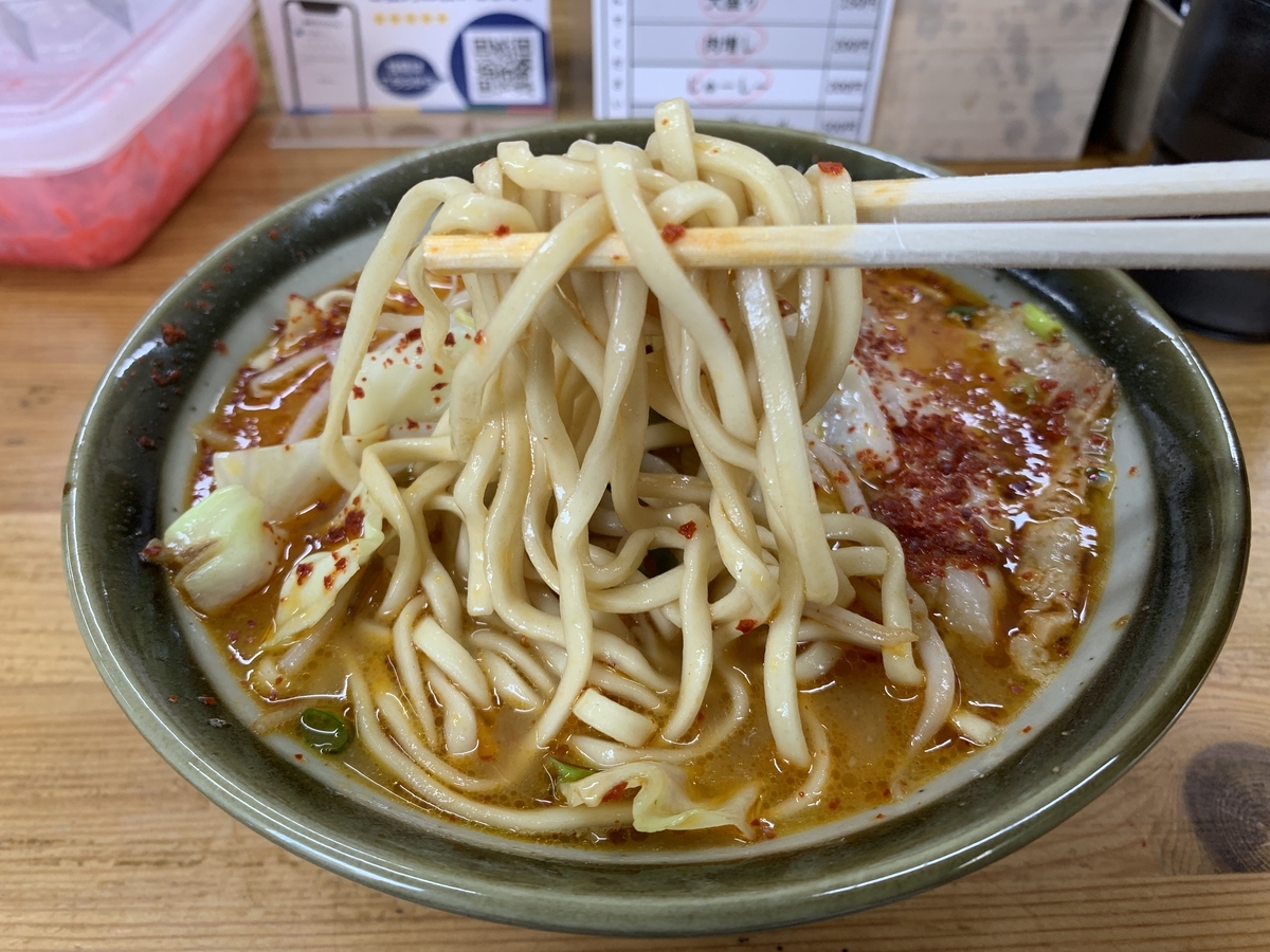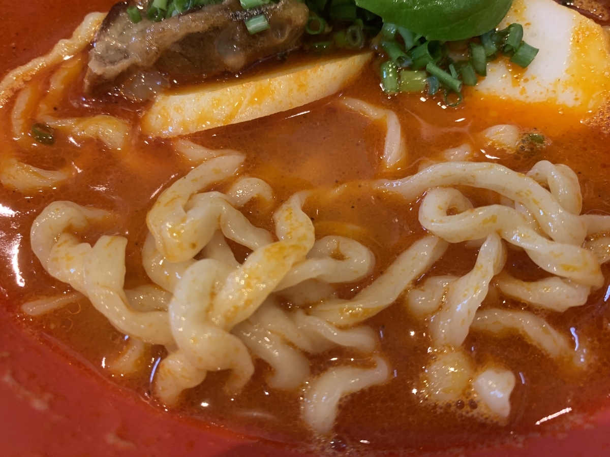 中太の縮れ麺はプリっとした歯ごたえ、辛いスープに合わせても負けないインパクトがあります。