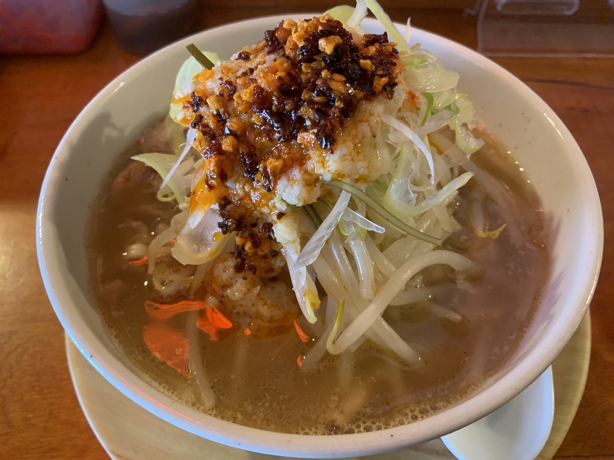 山盛りのもやしとネギ、手羽元、さらにニンニク、ラー油が載った破壊力抜群のトッピング。