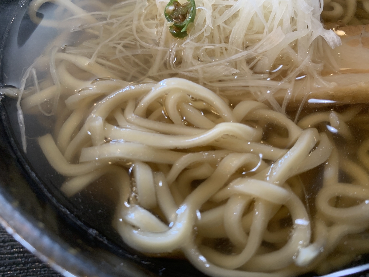 中細の平打ち麺で、しっかりとした歯ごたえと、滑らかな啜り心地の麺です。